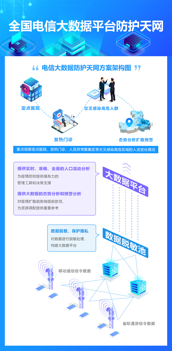我国拥有16亿手机用户,结合各部门快速联动,在对数据进行脱敏处理,保证用户隐私安全的基础上,电信大数据可以提供实时、准确的人口流动分析,为疫情防控提供强有力的管理工具和决策支撑,特别是重点需要关注的定点医院、发热门诊、人员聚集区等高危区域的人流变化情况;不仅如此,基于大数据的态势分析和预警分析,我们更加能够对疫情扩散趋势做到事先的研判,为提前防范、资源调配提供重要参考。
